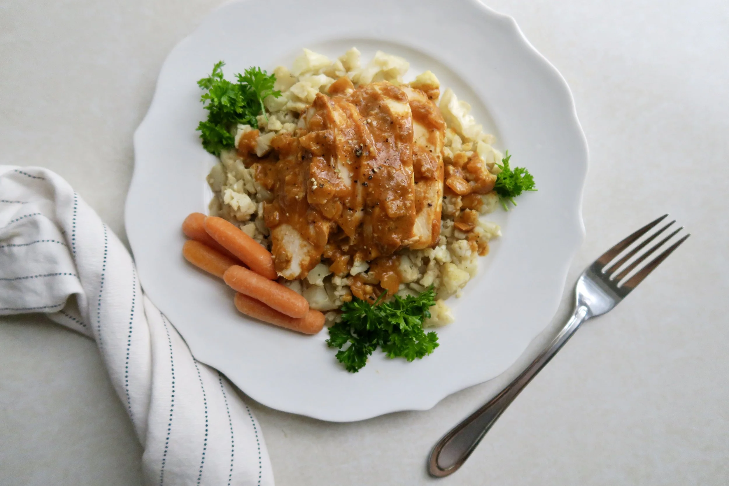 - Slice the chicken into strips and serve on top of the cauliflower rice.
